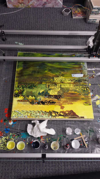 Experimentando aquí con "cimbrados trazado". En lugar de pintura hundimiento mediante jeringas, decidí en vez de eso mezclar la pintura con una viscosidad específica a gotear en un caudal que empareja la velocidad de avance de la impresora.