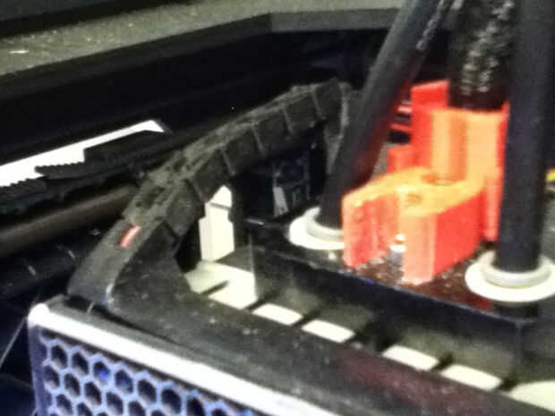 No sólo utilizo telar enrevesada, pero también incorporan cable cadena para los cables sueltos en el MakerBot.  Me gustó la manera en que los cables fueron encaminados en el replicador como vino de fábrica, por lo que sobre había alterado a un lado.  Usar la cadena de cable para alimentarlos desde el frente hacia atrás.   Si desea ver cómo esta idea, ir a: