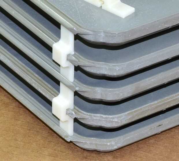 Como se puede ver, los nuevos clips no interfieran entre sí, y cada conjunto de clips me permite agregar 2 bandejas más a la pila. En general, necesito clips de menos y me ahorro en materiales y tiempo de impresión.