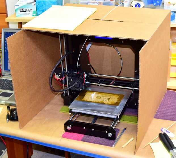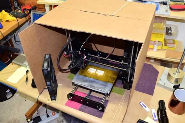 - Usted necesita una cama caliente. Sólo no calefacción las primera pocas capas, vas a necesitar calentar la construcción entera. Para ayudar a que necesita un recinto para mantener caliente la construcción. Para mi las pruebas iniciales con algunas pequeñas piezas he apagado el ventilador de techo y aire acondicionado. Entonces se coloca una caja de cartón alrededor de la impresora para evitar corrientes de aire. Puedes ver un ejemplo de esto en las fotos. Aquí estoy imprimiendo la bandeja espaciador clips la versión 2.0 de ABS natural. El ventilador adicional en la imagen se utiliza durante la fase de enfriamiento. Tarda un rato para la cama de aluminio para enfriar desde 100° C a algo que quiero tocar.