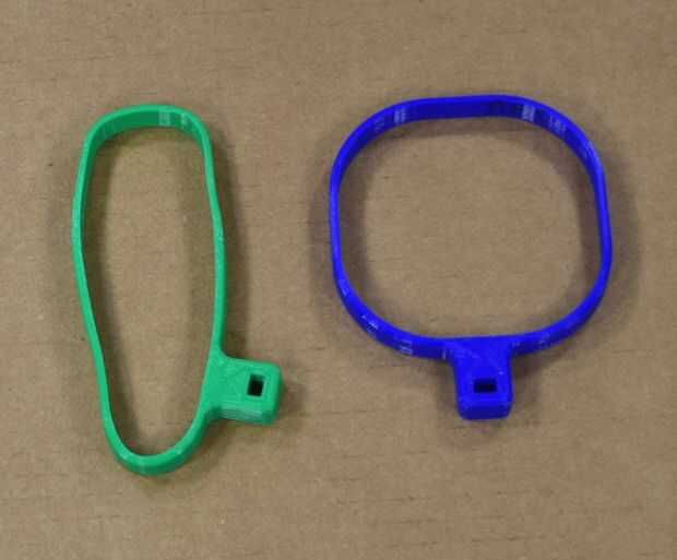 Este artículo, "la diferencia entre ABS y PLA para 3D impresión" proporciona una buena introducción a las diferencias entre los dos plásticos. La mayor diferencia, para mí al menos, es la más baja temperatura de ablandamiento del PLA. No deje partes PLA en un coche al sol. No derriten exactamente pero puede cambiar de forma. Las tres fotos anteriores muestran dos anillos idénticos de ABS y PLA antes y después de colgar de mi coche retrovisor durante el día. Fue sólo a 80° F parcialmente nublado y exteriores. A 90 minutos es 130° F (55° C) dentro del coche y el PLA había deformado. Esto fue una verdadera revelación. Yo había asumido que sería capaz de salir con la impresión sobre todo PLA. En cambio, algo que nunca podría terminar en el coche necesitará imprimir con ABS y otros plásticos de alta temperatura.