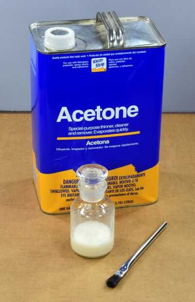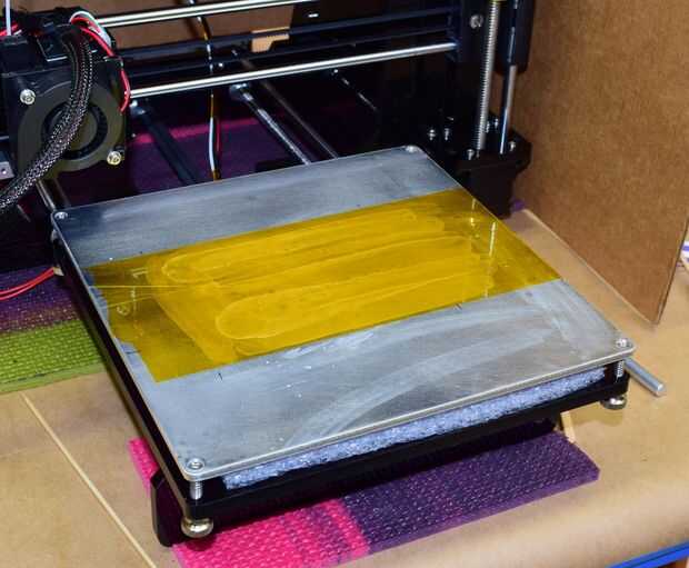- Adherencia de la cama adecuada es de suma importancia. Mezcla ABS en Kapton cinta funciona muy bien para mí. La mezcla ABS se hace de pedazos ABS disueltos en acetona a una consistencia similar a la leche descremada. Se necesita sólo una capa delgada en la cinta de Kapton. Utilizar un aplicador de pincel o algodón de utilidad para aplicarlo en el área de impresión. La imagen muestra un ejemplo de la mezcla aplicada a la cinta.