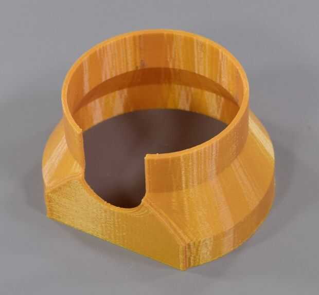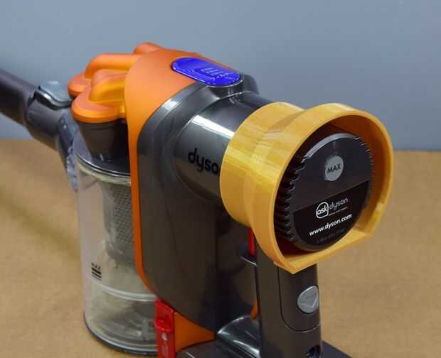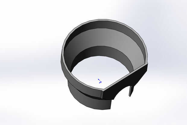 Tengo una aspiradora de mano Dyson® que funciona muy bien pero tiene una "función" de algo molesta. Los gases de escape sopla hacia fuera en los lados, en lugar de hacia atrás. Cuando estoy limpieza de mi escritorio y mesa de trabajo, este flujo de aire hacia los lados esparce polvo y papeles y es bastante molesto. Solo he esperado para que el envase de plástico desechado derecha hacer un conducto para dirigir el flujo de aire. Ahora, con la impresora 3D tengo la oportunidad de resolver el problema. Las imágenes muestran la representación de mi programa de CAD y la aplicación final. Informática diapositivas justo sobre la cubierta del motor, trabándola en su lugar y hace exactamente lo que quiero. No más polvo y piezas dispersaron como estoy tratando de limpiar mi mesa de trabajo.