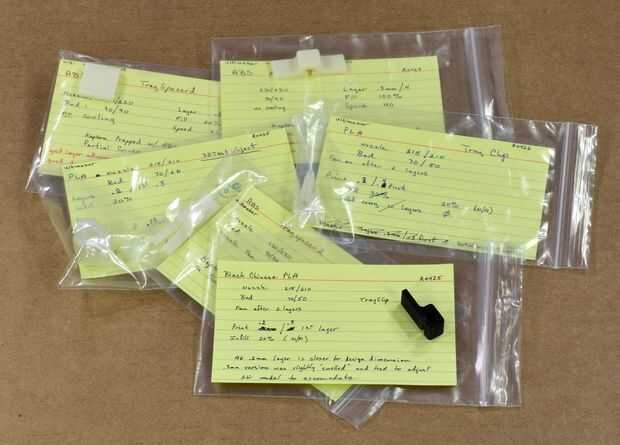 Un ingrediente clave para impresiones exitosas es mantener buenos registros. Cada modelo y cada marca del filamento pueden requerir diferentes configuraciones. Cada vez que imprimo, hacer un registro de parámetros de clave que utiliza en el programa de corte. Puse en una tarjeta de índice 3 x 5 y poner en una bolsa de plástico junto con una muestra de la impresión. La imagen muestra una colección de registros. Los valores que aquí en la lista son los de SLIC3R.