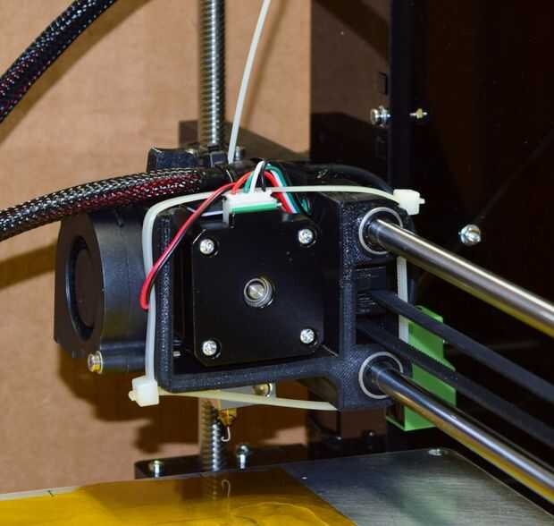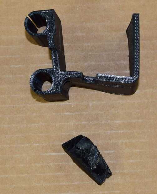- Las piezas impresas de plástico están hechas de PLA en vez de ABS. Esto dio lugar a piezas de ablandamiento y deformación. Tomó un par de intercambios de correos electrónicos para obtener los archivos STL correcto para mi impresora. Luego encontré alguien localmente a través de 3DHUBS que me haría un reemplazo con ABS (se puede ver una foto de mi derretido X carro y ventilador del conducto por encima de.) Preveía algunos problemas con el carro de X desde el principio - fue un poco animoso y había reforzado con un cintillo durante la construcción inicial. (Ver segunda foto). Ya he comprado un carro de metal X reemplazo que encontré en eBay. En vista de mi experimento de coche calientes, a ser reimpresión todas las piezas con ABS.