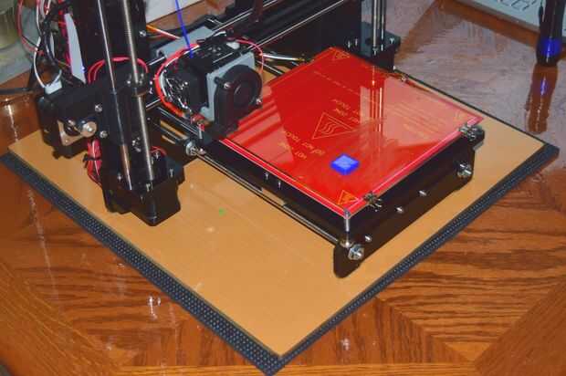 Uno de los inconvenientes del diseño Prusa I3 es la débil conexión entre el carro del eje y el resto de la estructura. Cada vez movía la impresora tuve que volver a calibrar la máquina. Yo ahora puedo apreciar el diseño de máquinas que tienen un marco de caja rectangular, como Solidoodle . VI uno en una quedada de impresora 3D recientemente y era sólida como una roca! Dirigí algunos de esto en mi impresora pegando los pies de marco a una base de fenólico espesor 1/4 de pulgada. Este es un material muy rígido y pesado. Apliqué liberales filetes de goma cemento (Household Goop®) alrededor de todas las partes del marco que tocó la base. Revisé que los tres ejes con un metal ángulo recto y dejar que el pegamento sequen durante varios días. El marco está ahora muy tieso, y puedo mover fácilmente la máquina recogiendo la base.