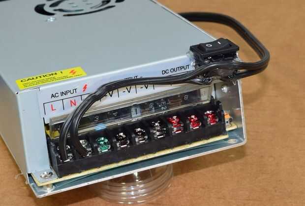 He añadido un interruptor simple a la fuente de alimentación. El ventilador en él es bastante ruidoso y me cansé de tener que desconectar. Mi caja de chatarra tenía un eje de balancín interruptor en él y pegadas a la fuente de alimentación con algún cemento de goma, cortar uno de los conductores del cable de alimentación y soldar los extremos del interruptor. Luego cubrí las conexiones de soldadura liberalmente con más pegamento de caucho.
