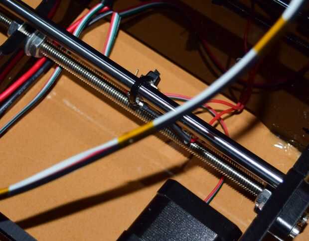 El interruptor de límite de eje y originalmente fue unido al carro móvil. Incluso cuando montado el tiempo de la máquina la primera alrededor de mi pensamiento fue una mala idea. No había ninguna razón para ello puesto que fácilmente podría ser unido a una parte no se mueve del marco y dejar que el carro golpee en ella. Cada ahora y después el cable había atrapado en los bordes de plástico del marco y causó problemas. Mi solución simple fue amarra el interruptor a uno de los carriles donde se ser golpeado por uno de los rodamientos lineales. Luego empujó en posición con el carro y añade unas gotas de pegamento de caucho para trabarlo en su lugar. Problema resuelto - no más que mover los cables.
