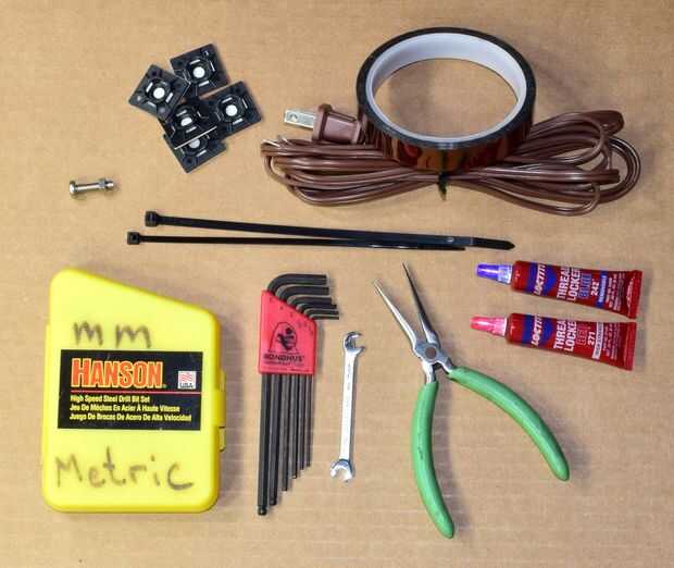 El kit viene con suficientes herramientas, mostradas en la primera foto, a montar. El proceso de compilación se hace un poco más fácil poniendo también algunos de su propio. Particularmente útiles son extremo de bola métricas hexagonal, largo alicates para colocar las tuercas y una pequeña llave hexagonal para apretar las tuercas. No tengo una versión métrica pero la 7/32" es un ajuste perfecto.