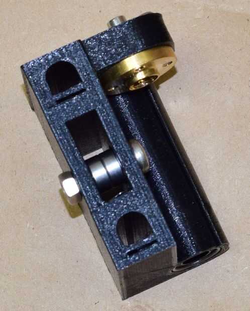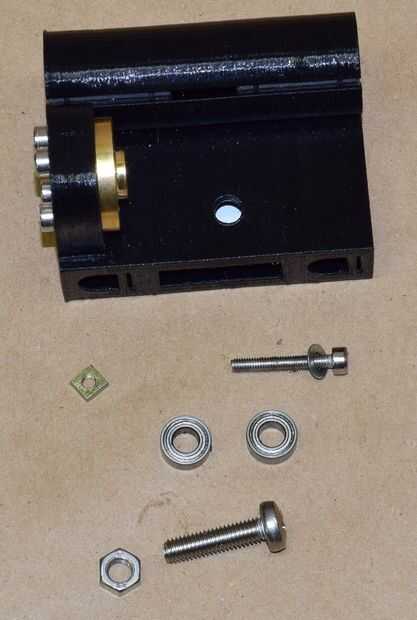 Entonces, como yo estaba montando los componentes del eje x me di cuenta de algo raro sobre la correa. Un tornillo de 3mm iba a través de orificios de 5mm en el plástico impreso, con 2 cojinetes, también con 5mm diámetro interior. Debido a imperfecciones de impresión, este tornillo estaba sentado en un ángulo. No bonita! En mi mesa de trabajo las fuentes he encontrado un tornillo 5 x 20 mm que se adaptan muy bien a través del plástico y rodamientos, perpendiculares al recorrido de la correa. La cabeza y la tuerca son lo suficientemente grandes para sentarse directamente en el plástico. Ya que no pude apretar la tuerca mucho sin doblar el plástico, solía armario hilo Sujete en su lugar.