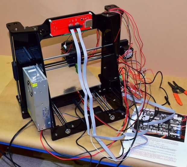 En comparación con algunas de las instrucciones de construcción y vídeos que he visto de otros kits, este facilita el cableado. Todos los cables para los motores, finales de carrera y sensores térmicos tienen tapones de conexión. Sólo el ventilador, cama caliente, extremo caliente y cables de potencia necesitan para ser despojado y se insertan en terminales de tornillo. No se requiere ninguna soldadura. Estoy un poco quisquillosos acerca de cableado por lo que la lata los extremos de los cables pelados para evitar que se deshilache. También estaba contento con el trabajo de soldado en la cama caliente para eliminar todos los globos de soldadura original, volver a recortar los cables y soldar a mi satisfacción. Entonces recobré el cableado expuesto con trozos de cinta de Kapton.