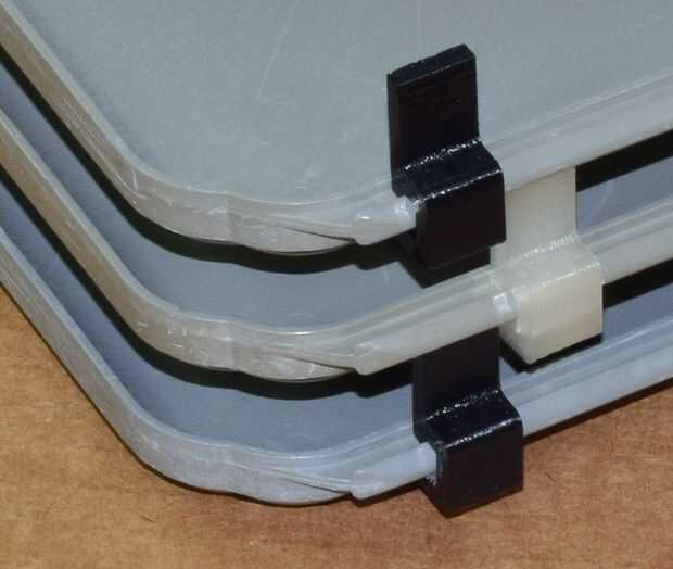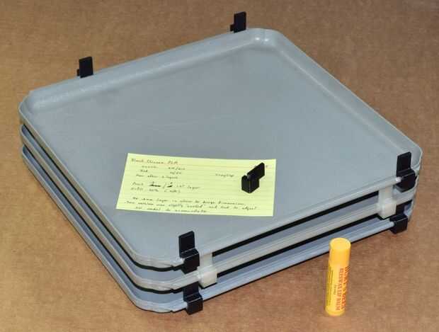 Hace varios años compré algunas aerolínea utiliza bandejas de comida. Estos son útiles para organizar proyectos, ordenar piezas y así sucesivamente. Siempre he pensado que sería bueno tener algunos clips extraíbles que podrían unir a los bordes de modo que las bandejas apilables, con espacio entre ellos. Con frecuencia tengo Proyectos donde pintura necesita para secar o necesidades en muchas partes de epoxy y apilar fácilmente bandejas ahorraría mucho espacio. Afortunadamente, las bandejas tienen un carril por ambos lados que hace que sea conveniente poner algunos clips. Estas fotos muestran la primera iteración de diseño y ejecución.