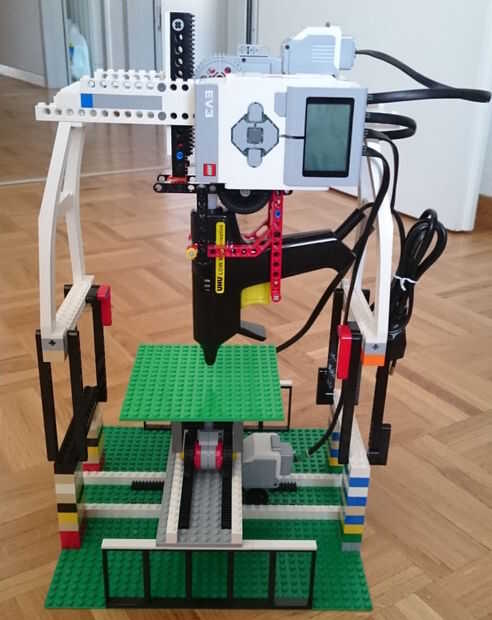 Se trata de una impresora 3D constituida el kit de Lego Mindstorms EV3. La base de es la pluma 3D que dispensa el plástico derretido. Movimiento de la pluma en 3 diferentes ejes es aprovisionado por motores mindstorms y son controlados por lego minds