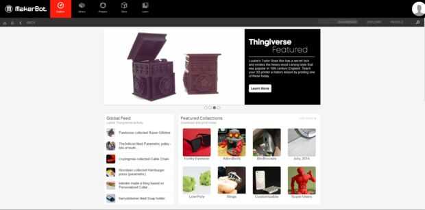 Escritorio de MakerBot consta de cuatro secciones: explora, tienda, biblioteca y preparar.