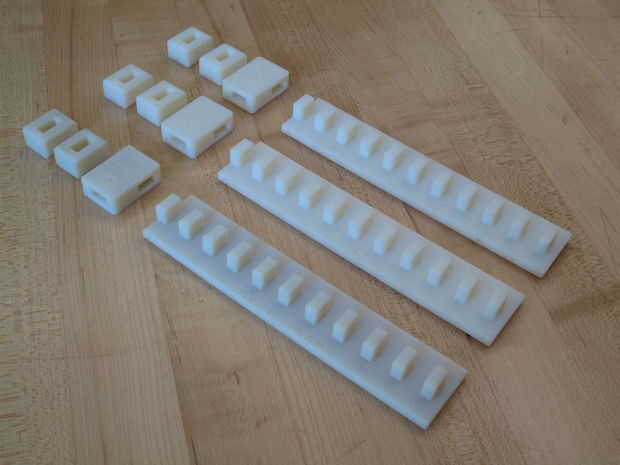 Piezas de la mortaja: una de las piezas de la mortaja tiene dos mortajas, los otros dos tienen uno cada una mortaja. Las mortajas nominalmente tienen las mismas dimensiones de. 250" x. 500". Juntos representan mortajas que imprimieron hacia cuatro direcciones diferentes: + X, + Y, + Z y -Z.