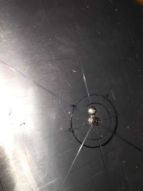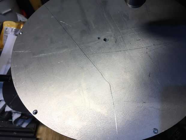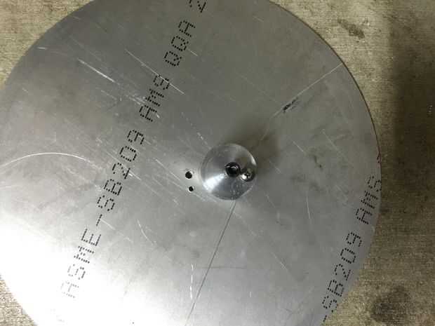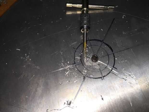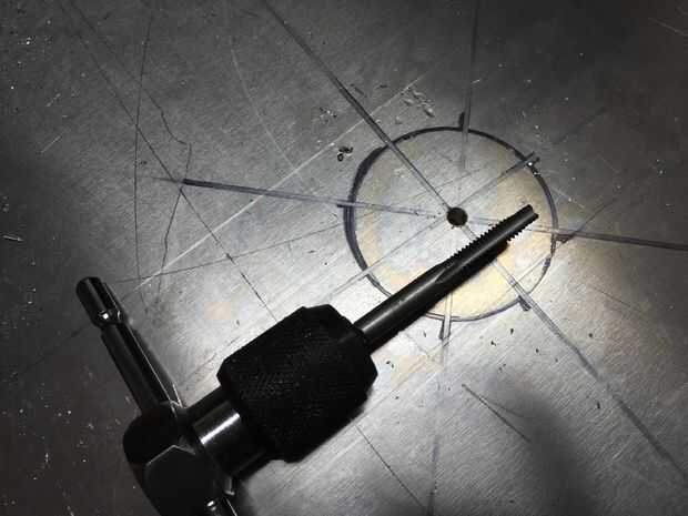 Utilice cinta de doble cara para sostener las placas juntas. También puede utilizar un perno de 1/4"-20 a través del centro para mantenerse centrado. Luego marque y taladre los orificios alrededor de los bordes. Utilicé el antiguo cauce del warped climatizado (presionado plano) para marcar los orificios. Luego perforados cada marca con un taladro de centro para iniciar el agujero y siguió a través de ambas placas con una broca #36.