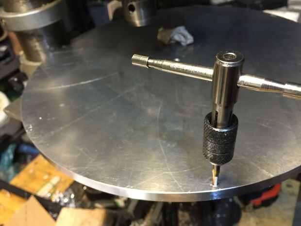 Seleccione una placa a la placa base. Éste se sentará en la base de la impresora y a soportar la placa de cama caliente. Hilo de cada uno de los orificios previamente perforados con un toque de #6-32. SEA cuidadoso al usar el grifo. Un toque de #6 se rompe muy fácilmente! Ir lento, uso mucho aceite y mucha inversión y compensación.