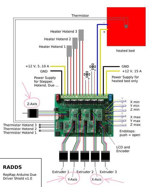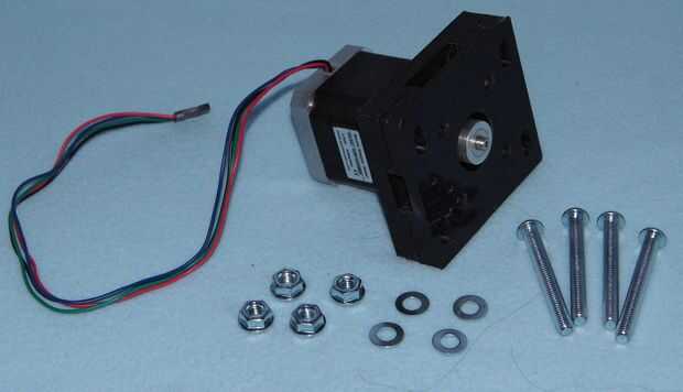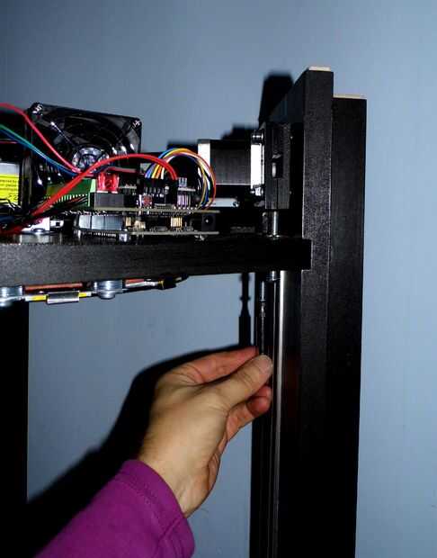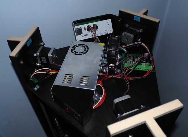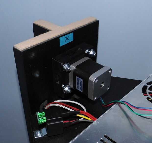 Ahora voltee la impresora y coloque sobre una superficie blanda, por ejemplo en la alfombra o un paño. Coloque los tres conjuntos de motor, con los alambres apuntando hacia el panel horizontal. Cada Asamblea necesita 4 tornillos de cabeza de botón M6x50, 4 arandelas M6 y 4 tuercas M6 con bridas. No apriete los tornillos y asegúrese de que las Asambleas pueden deslizarse hacia arriba y hacia abajo. Por ahora, empuje las Asambleas hacia la base. Atornille en 6 M6x50 tornillos el panel horizontal para actuar como tensores para los montajes de motor. Consulte el diagrama de cableado para conectar correctamente los conectores del motor (X/Y/Z). Sugiero para alimentar el cableado para el motor de X debajo de la fuente de alimentación y por debajo del ventilador de enfriamiento. Esto puede ser un poco incómodo. El cableado para el motor Y también puede ir debajo del ventilador, cruza el cableado para el motor X. Si esto resulta para ser muy complicado, simplemente vaya al lado del ventilador en su lugar.