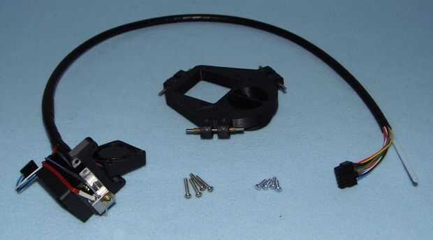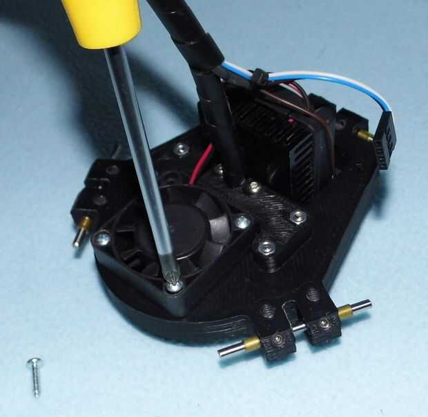 En primer lugar, retire el soporte del sensor el efector final. Fije el cabezal de impresión para el efector final. Esto no será fácil ya que hay poco espacio entre el efector final y el conjunto del cabezal de impresión. Asegúrese de que los cables estén lejos del disipador de calor ya que es la parte más ancha de la Asamblea. Utilice a los tornillos autoroscantes para conectar el ventilador de enfriamiento. Tenga en cuenta que estos tornillos sólo necesitan apretarse muy ligeramente.