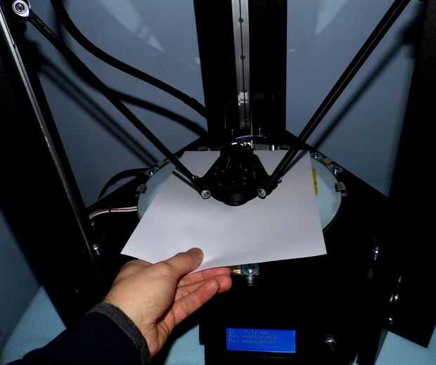 Volver a colocar el efector final a la impresora. Realizar un 'Home All' y navegar por el menú de 'Configation'. Seleccione 'Z Calib.' y 'Z pos rápido' se usa para hacer la cabeza de impresión cerca de la cama. Tan pronto la cabeza dentro de un par de milímetros, volver al menú y seleccione 'Posición de Z'. Esto permitirá el ajuste fino en pasos de 0,01 mm. Use una hoja de papel para bajar el cabezal de impresión hasta que el papel no se puede mover más libremente, es decir. la hoja de papel está empezando a convertirse en 'pinchado' por la cabeza de impresión. Retire el papel y bajar la cabeza por otros 0,08 mm. Tiene en cuenta el espesor del papel. Ahora seleccione ' Set Z = 0' para almacenar el nivel cero en la memoria EEPROM. La impresora ya está calibrada.