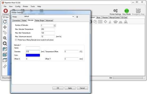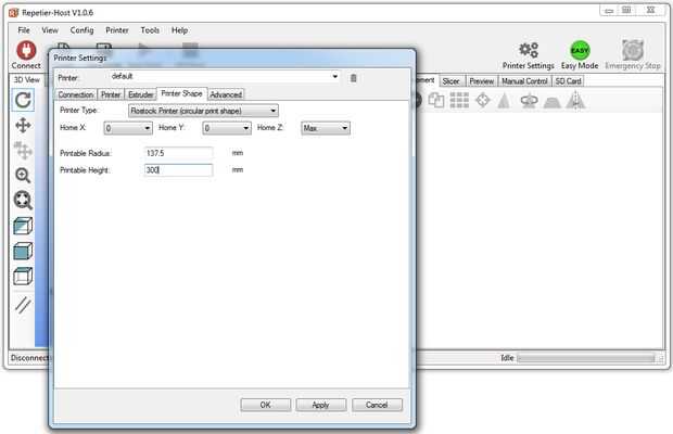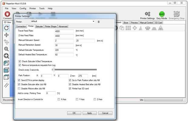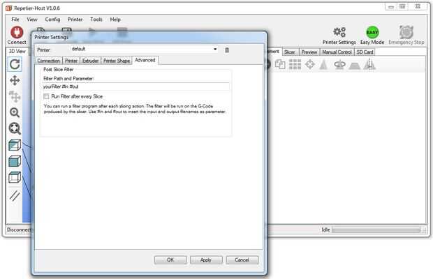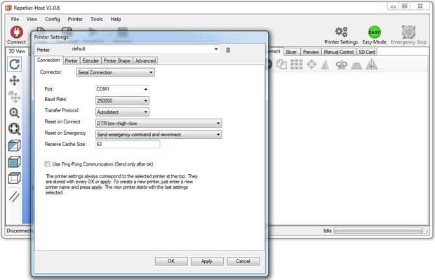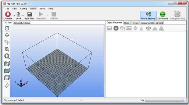Descargar la última versión de Repetier e instalarlo en su computadora. Utilizar las capturas de pantalla para configurarlo. Nota: cuando instale la impresora (utilizando el 'puerto de programación) a un puerto USB en tu PC, un nuevo puerto COM aparecerá el que tendrá que ser seleccionado. Las imágenes fueron tomadas de un PC con Windows 7, utilizando Repetier Host 1.06 (adjunta a este paso). Se adjunta a este paso es el archivo Slic3r.rar, que contiene algunos ajustes. Un-rar y copiar la configuración a la carpeta de configuración de Slice3r (eg. C:\Users\YourName\AppData\Roaming\Slic3r) o abrir los archivos en Bloc de notas como punto de partida para crear sus propios ajustes.
