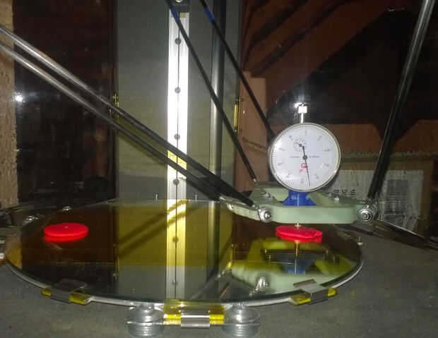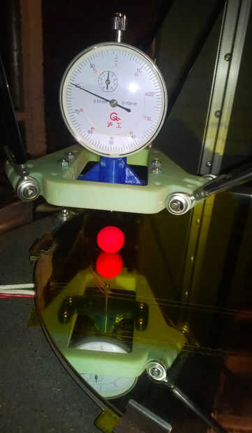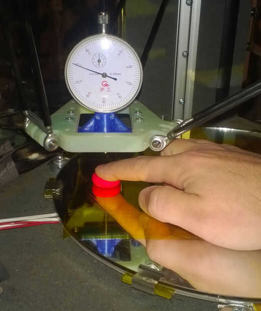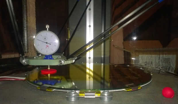 Utilizar un reloj DTI para la cama a las tres torres, como se describe en un paso anterior (para una cama redonda, las posiciones que sugiere son: X = 0, Y = 120 para Torre de Z; X =-104, Y =-60 para X torre; X = 104, Y =-60 Torre Y.). Además la punta de prueba el centro de la cama, es decir. X = 0, Y = 0. Una diferencia entre las mediciones promedio de la torre y la medición central indica que el carro de la impresora se está moviendo de forma cóncavo convexa en lugar de moverse en un plano. Para elevar la posición central en relación con las posiciones de la torre, reducir el valor para PRINTER_RADIUS y viceversa.