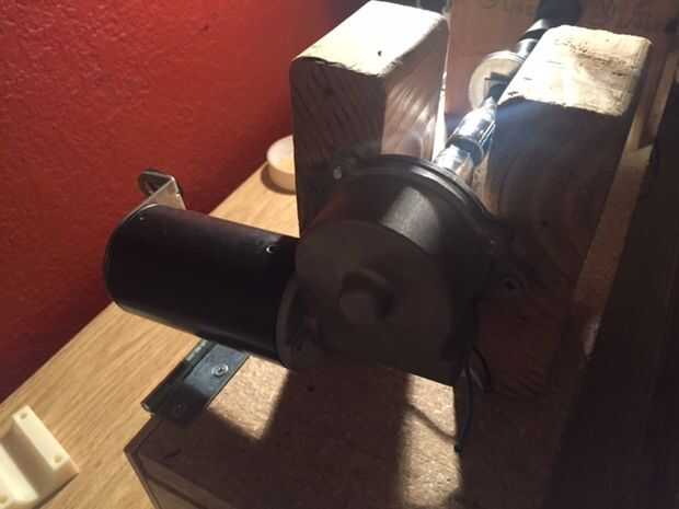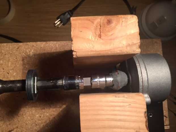 Usé los orificios existentes ante el motor al tornillo en dos bloques de madera montado en la parte posterior de la extrusora. Montaje del motor a la altura correcta es muy importante! Si el motor está montado en un ángulo incorrecto o la altura, demasiado estrés serán colocado en el motor y torneado liso no se logrará. El método que utiliza para el montaje permite una buena cantidad de ajuste, por lo que podrá ajustar hasta que la alineación es perfecta. Ahora para montar el taladro en el motor. El eje del motor es de rosca, así que lo que hice fue usa algunos epoxi para fijar una tuerca en el extremo de la misma y apretar hacia abajo muy fuertemente. Entonces, en esta tuerca he puesto una toma de tamaño correcto que se adapte a un trinquete de 3/8". Entonces yo cortar el acero cuadrado a la longitud apropiada, entonces a que utilicé otro socket que encajen firmemente en el extremo de la broca del taladro. En esta articulación, cubrí todo con epoxi para ayudar a disuadir el taladro resbale. Si cualquier conexión parece debilitarse en su disposición, no dude en Añadir epoxy, dolerá demasiado!