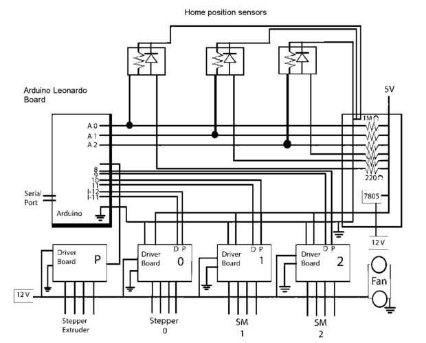 Se utilizaron cuatro tablero de conductor del motor de pasos diferentes reguladores y motores de pasos de estirador. Controladores para deslizadores son controladores comunes de 12V pero para extrusora utiliza micro paso a paso para mantener la protuberancia correcta. Una placa Arduino Leonardo fue utilizada como controlador de nuestra impresora 3D. Tres entradas analógicas fueron utilizados para detectar las señales de los sensores de posición y también ocho salidas digitales que envían impulsos para cuatro motores paso a paso. Temperatura del extremo caliente y el calentador están controladas por separado por reguladores individuales.