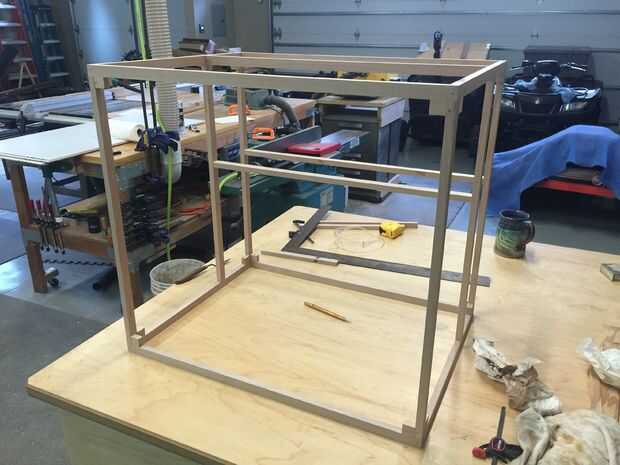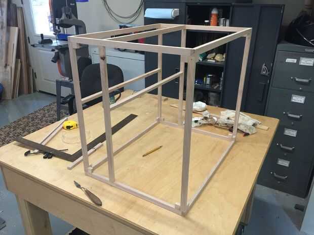 He decidido empezar con un marco de madera duro por varias razones. Uno de ellos que sería muy difícil crear una caja estructuralmente de 1/4 en MDF con ninguna clase de soportes internos. En lugar de tener que clavo perno 1/4 en MDF a otras piezas MDF me permitió a prender todos los muros a la estructura que tenía una cantidad considerable de mayor superficie. Como se puede ver en el cuadro incluido, el marco incluye un área que será un recinto para las bobinas del filamento. A más articulaciones incluí bloques para aumentar que la rigidez de la estructura y fijación se realizó mediante la aplicación de pegamento para madera y perno inmediatamente clavado con una pistola de clavos.