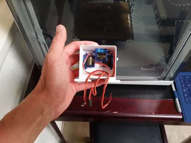 Descargar el archivo STL "cuerpo de robot" e imprimirlos. Colocar los servos. Los motores deben ajustarse a derecho en los agujeros de montaje.