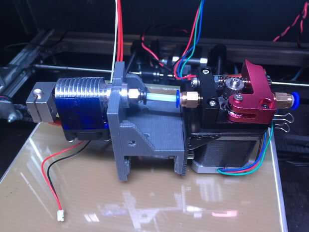 Antes de deslizar el extremo caliente en su lugar en el soporte, una longitud de tubería de PTFE debe cortarse para conectar la extrusora con el extremo caliente. Asegúrese de tener en cuenta la profundidad que se desliza el tubo en el extremo caliente, que es cerca de 3/4 de la longitud del extremo caliente del todo. Las conexiones en el extremo caliente y estirador de permita que el tubo en, pero no hacia fuera así que Deslice el tubo en parte y Inserte el extremo caliente en posición en el soporte impreso. Consulte las fotos para más aclaraciones.