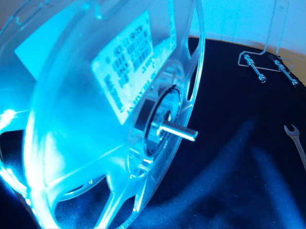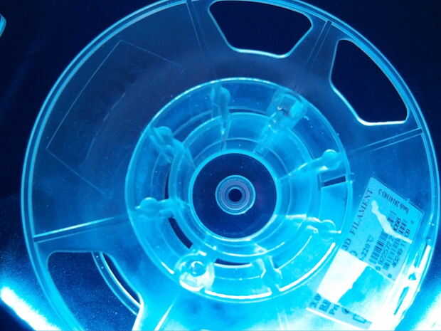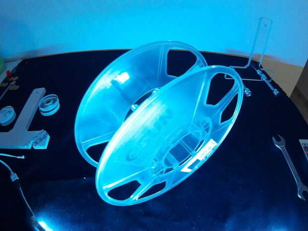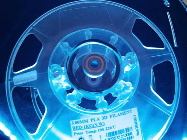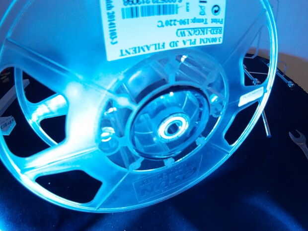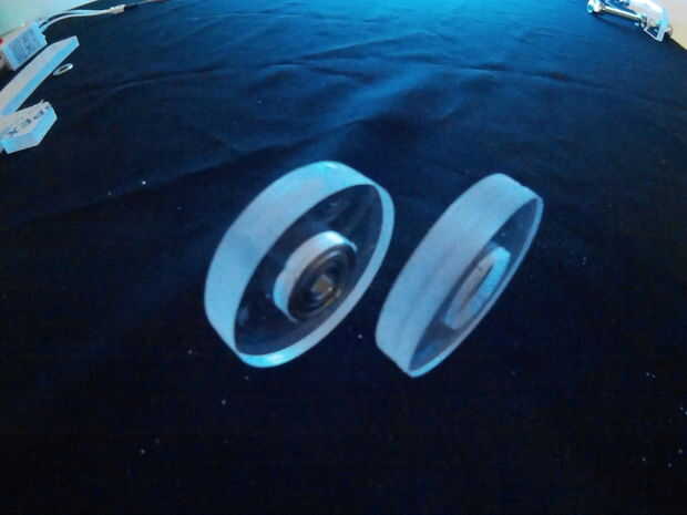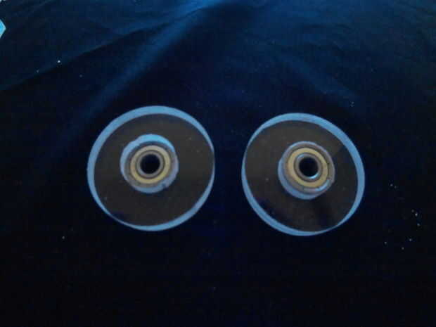 Los donuts acrílicos, han sido fresadas para encajar los rodamientos ZZ608 dentro, es un ajuste apretado, uso la fuerza para albergar en su lugar. El diámetro exterior de los donuts debe caber el diámetro interior de la bobina de filamento impresión 3D.