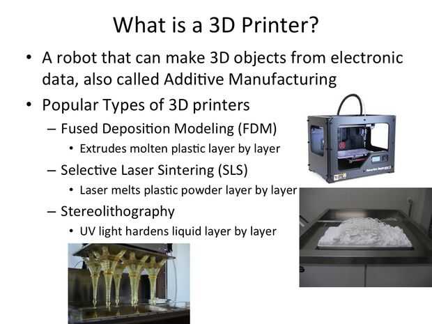 • Un robot que puede hacer objetos 3D de datos electrónicos, también llamado aditivo fabricación