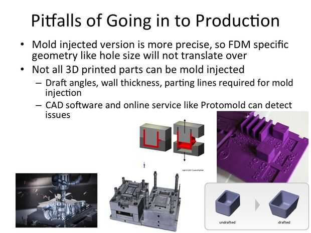 • No todas las piezas impresas 3D pueden ser molde inyectado – proyecto ángulos, grosor, separación de líneas requeridas para moldes de inyeccion – software CAD y servicio en línea como Protomold pueden detectar problemas de
