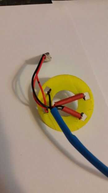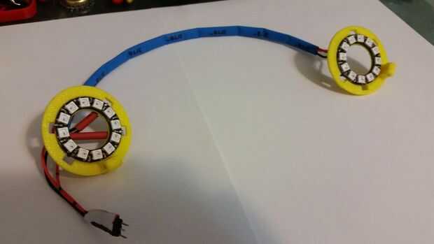 Cuando esto pensé que la parte más difícil diseñar ejecutarían los cables y averiguar cómo dejar espacio para la soldadura de los alambres, guesstimated el ángulo para ser un grado 30 offset y se aseguró de hacer los agujeros lo suficientemente anchos como para los cables. Mantenga los cables juntos utilicé un pie largo-tubería encogible todo esto fue un proceso muy fácil, sólo tomó unos ajustes que más adelante agregaré en. Tengo un anillo de 24 píxeles ahí así que me alojé atento para más!