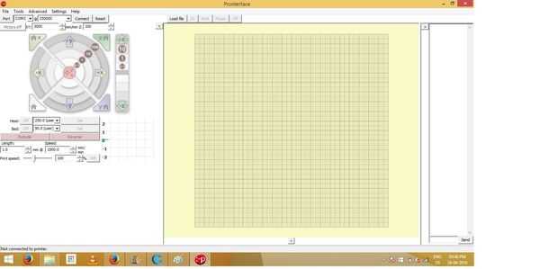 Conecte la impresora y poner en marcha el pronterface. Detectará automáticamente el puerto com. Ajuste la velocidad en baudios visto en configuración (#define BAUDRATE 250000) en el pronterface. Y si todo va correcto, se puede ver que la impresora está conectada en Pronterface.