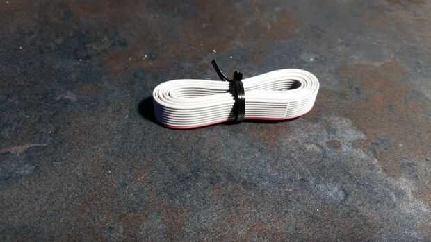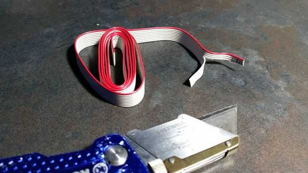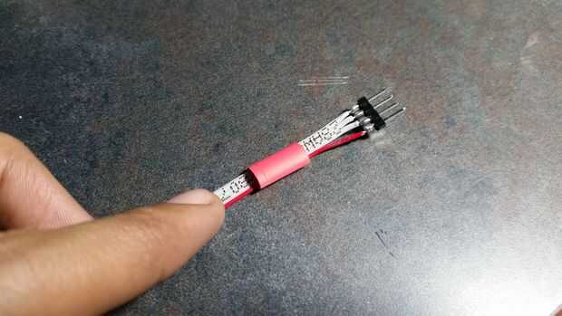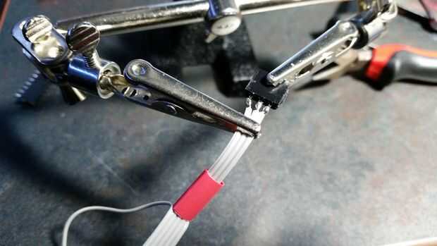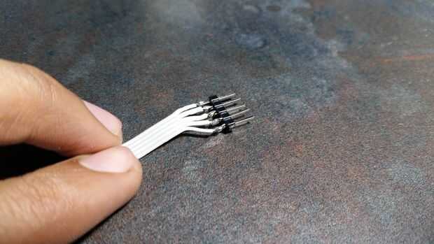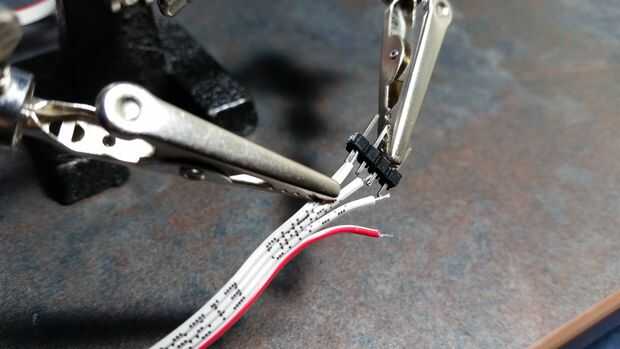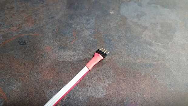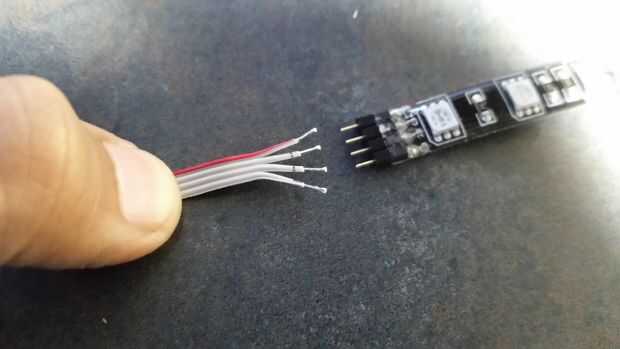 La soldadura de las cabeceras de macho de 4 pines al cable cinta con 4 filamento. Nota: el que está en la tira del LED puede ser diferente.