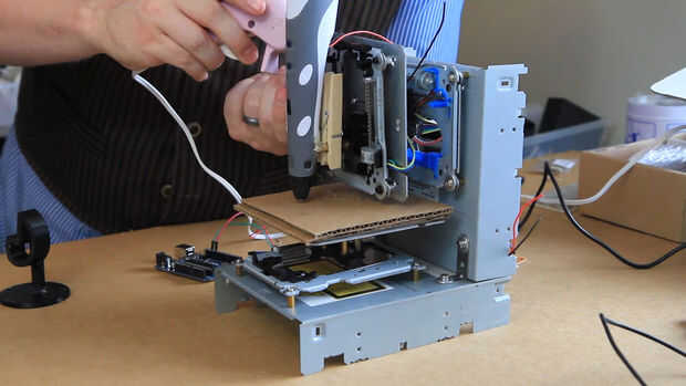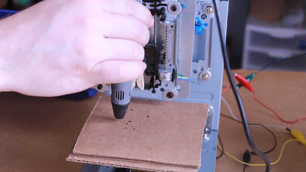 Con el circuito de conmutación atado con alambre para arriba y funcional, ahora tenemos que empezar a poner todo junto. Desea montar la pluma 3D para el eje z de la máquina CNC. Simplemente utilicé alfileres de la ropa y pegamento para asegurarlo en su lugar. Usted quiere asegurarse de no tambalearse alrededor.