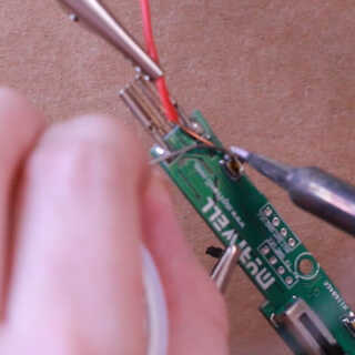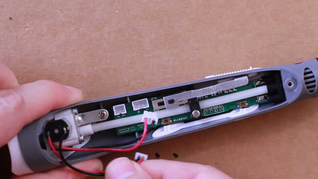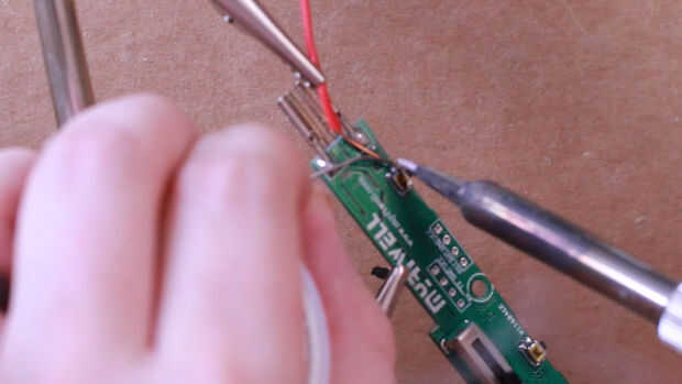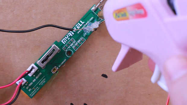 Antes de re-montaje todo juntos de nuevo, toque los cables para asegurarse de que todo funciona y se suelda correctamente usando un resistor del ohmio 1 k. Y para asegurarse de que las conexiones no se unsoldered, un buen truco es poner un poco de pegamento caliente en cada conexión para mantenerlos en su lugar. Y una vez que tengas los cables asegurados, puede empezar a volver a montar el aparato. Usando un taladro o un cuchillo, puede perforar un agujero pequeño en el panel posterior del dispositivo para hacer un lugar para los cables correr a través.
