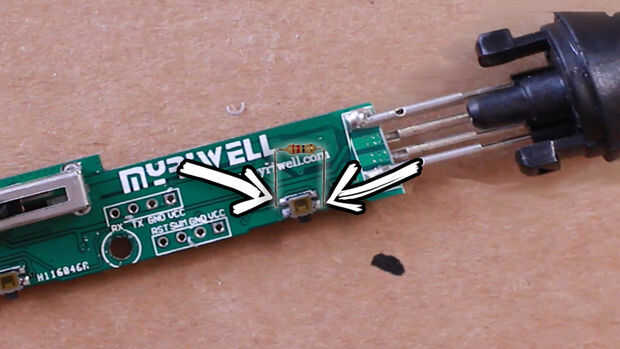 Una vez hecho esto, verá el botón de extrusión hacia adelante. Debe tener 4 cables que salen de él, uno en cada esquina. Queremos probar para ver que combinación de plomos de accionar el motor. Antes de que lo podemos hacer, sin embargo, debemos volver a conectar algunas partes: el final/nozle caliente y el cableado de la energía motor jack insert. Con esos dos elementos a conectar, puede encender la pluma 3D. Una vez que la luz es verde, tome un resistor del ohmio 1 k y tocar un extremo a uno de los conductores y el otro extremo al otro conductor. Prueba cada hasta que escuche el motor de extrusión comienza a girar. Una vez que has encontrado una combinación correcta de conductores del botón, el siguiente paso es soldar un cable a cada conductor. Los conductores son muy pequeños, así que cuidado de no usar demasiada soldadura y que la soldadura todo los componentes que usted no debe terminar.