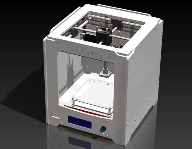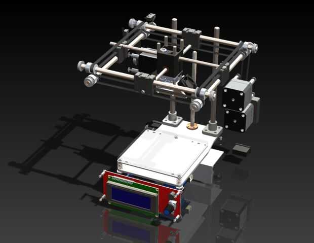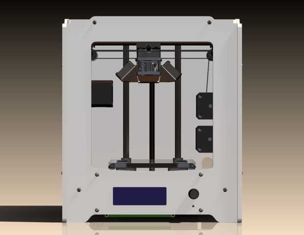 Usando los dibujos para la impresora 3D Ultimaker 2 Go existente como una plantilla creada la impresora toda en SolidWorks (he incluido todos los archivos de SolidWorks así como paso archivos) con los ajustes considere necesario con el fin de reducir el costo. El corte de coste más grande proviene del uso de rampas 1.4 controlador y RepRapDiscount LCD inteligente (un total de aproximadamente $40) con el firmware de Marlin de código abierto en lugar de intentar adquirir la tarjeta de control de UltiMaker con la pantalla OLED ($200 +). También fui con una fuente de alimentación a bordo ($18,00) en comparación con el adaptador de alimentación DC de caro ($80) que viene con la impresora. Costo total es menos de $600 dependiendo de los componentes que elija para incluir/excluir.