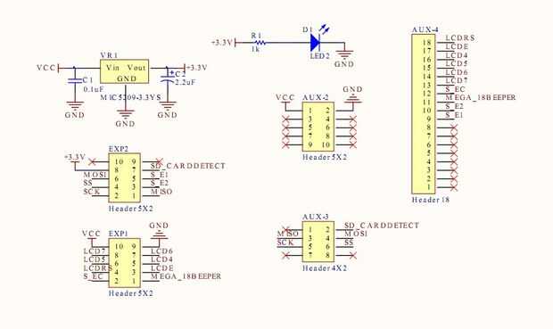 El zócalo del SD se conectar semejantemente para el MAX6675 como ambos comunican a través de SPI. Ajustar el interruptor de alimentación en la toma de corriente a 5V. Cable de la terminal G a cualquier tierra en el tablero de rampas. Conectar un alambre hacer la terminal en el enchufe y empalme con el cable MISO (AUX-3 pin 3) desde el MAX6675. Hacer lo mismo con el alambre CLK de la toma al cable SCK (AUX-3 pin 5) de la MAX 6675. Conecte la terminal DI del zócalo a MOSI (AUX-3 pin 4) terminal en el tablero de rampas. Conecte el terminal de CS en el zócalo a la SS (AUX-3 pin 6) terminales en el tablero de rampas 1.4. Por último, porque el nuevo zócalo de SD no tienen un pinout SD_CARDDETECT querrá ejecutar un cable desde la terminal SD_CARDDTECT (AUX-3 pin 2) a cualquier terminal GND en el tablero de rampas. Esto convencerá al controlador que una tarjeta SD se instala siempre y hacer que la pantalla lea como tal.