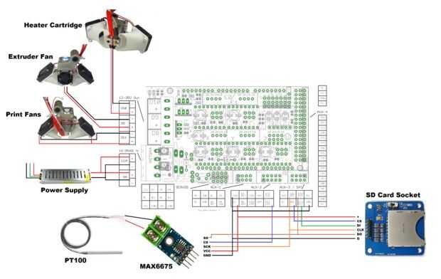 Ver el esquema adjunto muestra mi configuración de cableado especial para esta impresora. He hecho algunas modificaciones a los archivos de pin.h en el software de Marlin para acomodar esta configuración por lo que si sigues mi plomo definitivamente necesitará usar mi firmware.