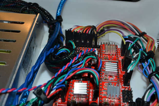 Los motores paso a paso 4 deben cablearse hasta sus drivers adecuados. No te preocupes sobre que orientación las clavijas están en este momento. Usted puede cambiarlo manualmente más adelante o en el firmware durante la configuración. Recorte cualquier alambre según sea necesario y ponerlos dentro de una envoltura de cable si quieres.