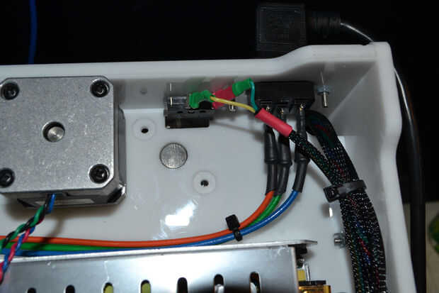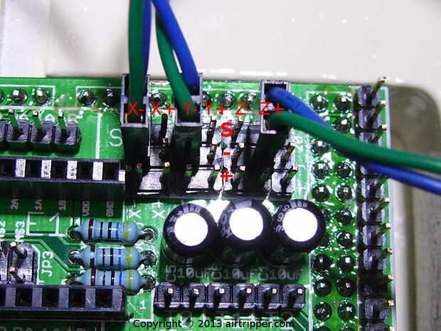La proyección de imagen de referencia el + y - lugares para el final deje los cables. En mi configuración particular fui con los terminales normalmente abiertos en los topes y la X, Y y Z + enchufe orientación (como se muestra).