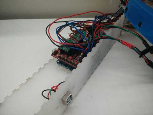 Ruta todo el cableado de paso 10 a través de la abertura en la parte superior del pedazo (cerca del motor Z) pegar la Junta rampas a la pieza inferior con pegamento caliente.