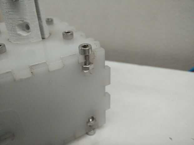 Ahora puede montar la caja entera con algunos de los M3 8mm tornillos y tuercas. NO APRIETE EN EXCESO. Si haces el acrílico será eventualmente crack que es lo que le ocurrió a mi acrílico así que tenlo en mente mientras aprieta los tornillos. La caja viene juntos como un rompecabezas y debe ser solamente una forma posible de poner juntos.