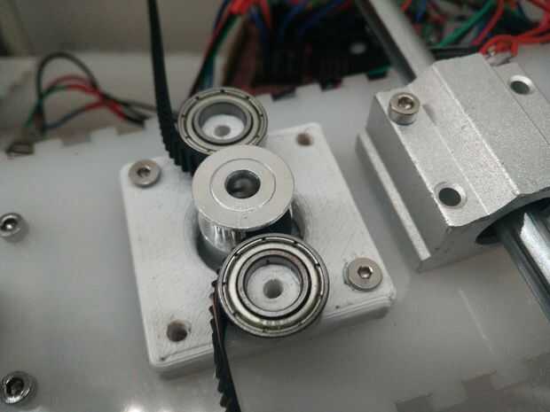 Pegar el tope para el eje x a la izquierda de la pieza de acrílico superior entre los dos rodamientos de SC8UU. Montar el 3d impreso X parte del eje donde está el motor del eje x. Luego pulse-Monte los dos cojinetes de 625zz en la pieza impresa 3D.