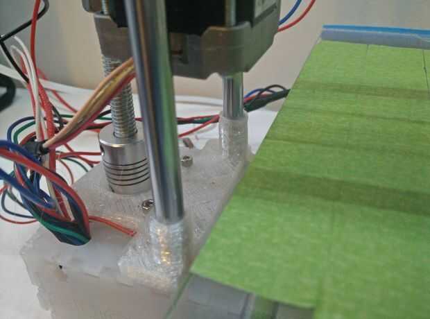 Para empezar el eje z, Monte la pieza Z-estabilizador para el motor principal de Z (el motor en la parte posterior de la impresora) con algunos pernos de 10 mm de M3. Luego, empuje las dos varillas lisas Z por los dos agujeros paralelos frente motor Z.