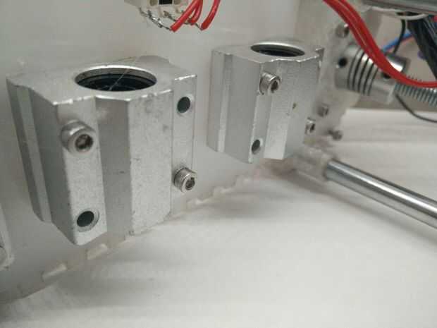 Usando el M3 tornillos de 8mm Monte el motor de pasos Nema 17 la principal pieza de acrílico. Esta es la pieza que tiene más agujeros. Hacer esto para los motores de la x y la z. Ahora instalar los cojinetes de SC8UU. Para ello, empuje los pernos de 25mm de M3 los cuatro agujeros de los tornillos, colocar el rodamiento sobre el acrílico, empuje los pernos a través del acrílico pedazo y añadir las nueces y apriételos hasta que no se tambalean.